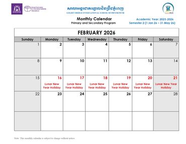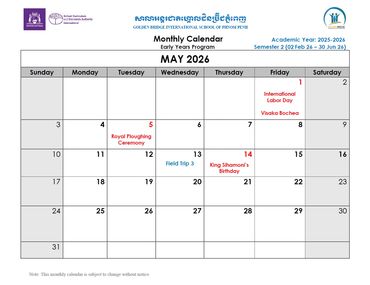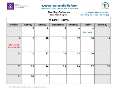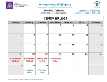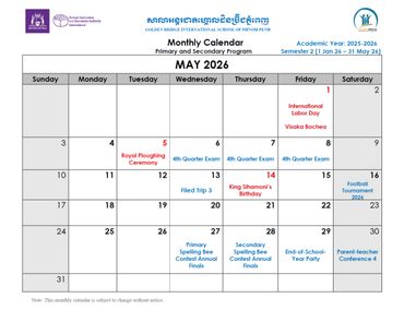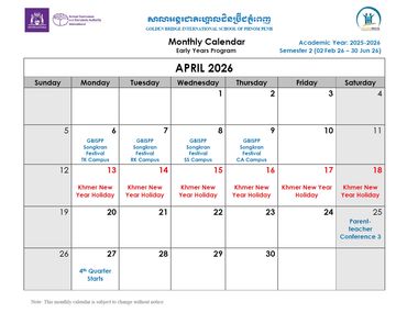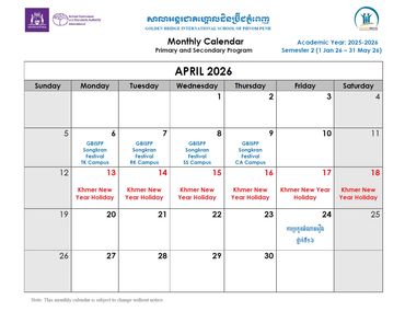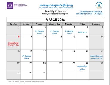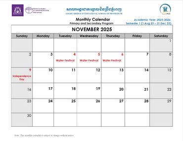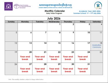 Welcome to the Official School Calendar of our Phnom Penh school! This is your essential resource for staying organized and informed about all the important dates throughout the academic year, aligned with the Western Australian Curriculum. Our calendar includes all scheduled holidays, term breaks, Parent-Teacher Conferences, school-wide events, and exam periods that are crucial for international education. Please check back regularly for the most up-to-date information to ensure you don't miss any vital events.